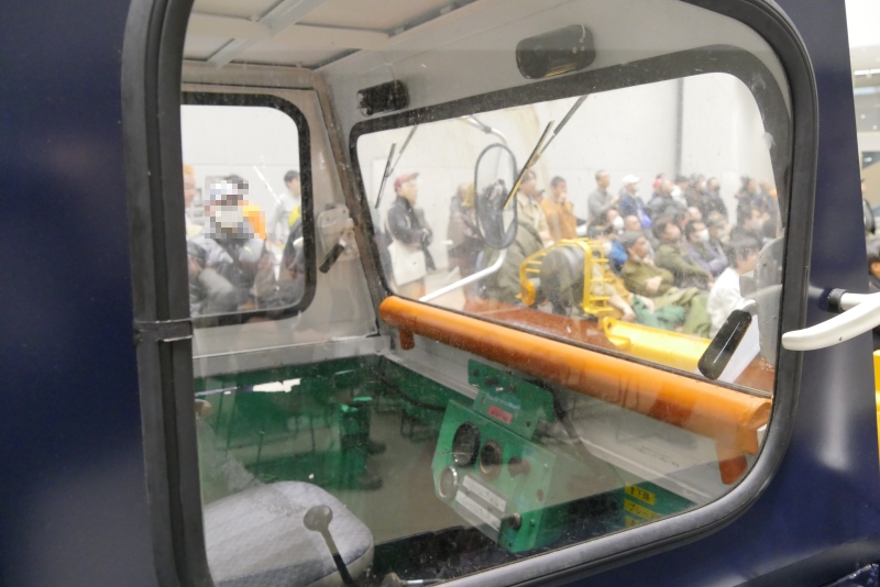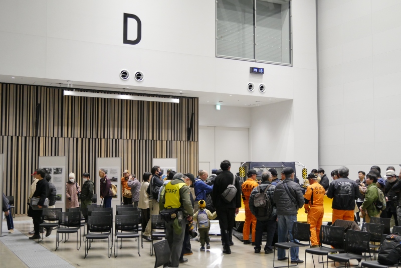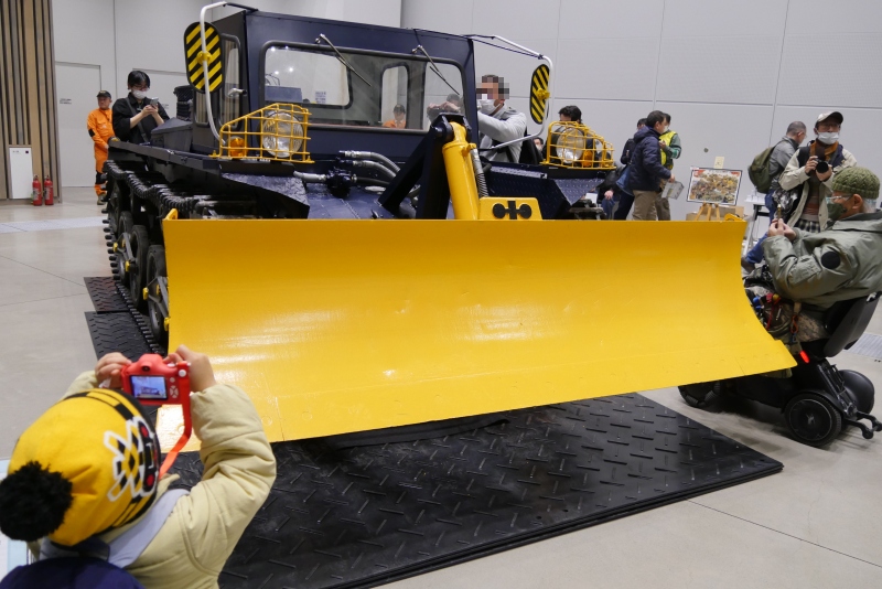 | 会場の外の写真は取り忘れて、展示施設の奥の部屋での開催風景から。改造ブルドーザーの解説時には、人だかりが出来ていました |